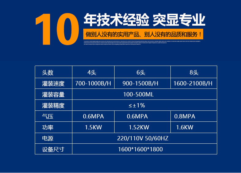 設(shè)備型號(hào) | 灌裝速度 | 灌裝容量 | 灌裝精度 | 氣壓 | 功率 | 電源 | 設(shè)備尺寸 |