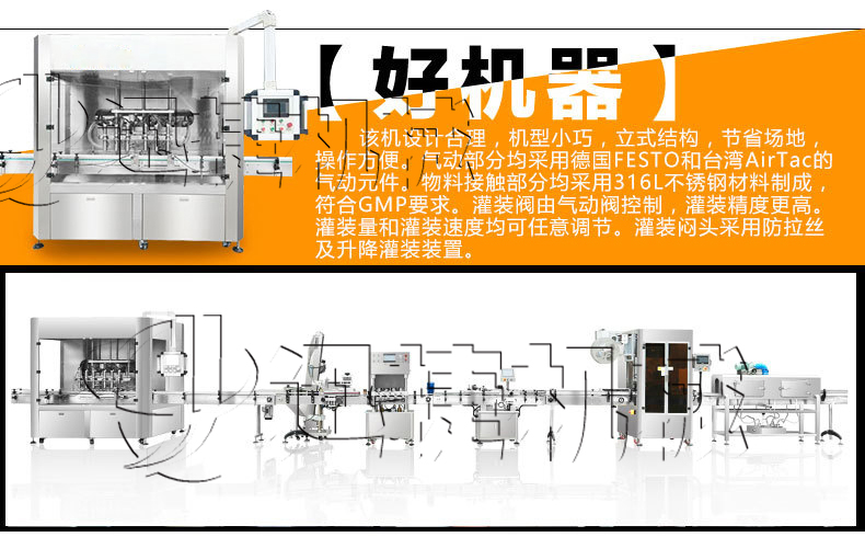 全自動(dòng)辣椒醬六頭灌裝機(jī)作為公司新研發(fā)的灌裝設(shè)備在市場(chǎng)上起到了關(guān)鍵性的作用,是集光,機(jī),電,氣于一體,采用活塞式定量原理,灌裝精度高,操作簡(jiǎn)單,維護(hù)方便,設(shè)備主要材質(zhì):采用SUS304不銹鋼制造,符合衛(wèi)生要求.灌裝過(guò)程采用亞克力透明板與外界隔離,保證灌裝的衛(wèi)生要求。灌裝采用壓力式灌裝,無(wú)需配裝高位罐,簡(jiǎn)化了安裝工序,提高了灌裝效率??蓮V泛應(yīng)用于食品、醬料行業(yè)產(chǎn)品的自動(dòng)化包裝生產(chǎn)。