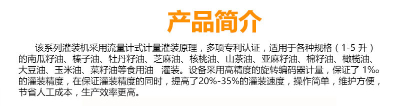 該系列灌裝機采用流量計式計量灌裝原理,多項認(rèn)證,適用于各種規(guī)格(1-5升)的南瓜籽油、榛子油、牡丹籽油、芝麻油、核桃油、山茶油、亞麻籽油、棉籽油、橄欖油、大豆油、玉米油、菜籽油等食用油灌裝。設(shè)備采用高精的旋轉(zhuǎn)編碼器計量,保證了1%o的灌裝精度,在保證灌裝精度的同時,提高了20%-35%的灌裝速度,操作簡單,維護(hù)方便,節(jié)省人工成本,生產(chǎn)效率更高。
