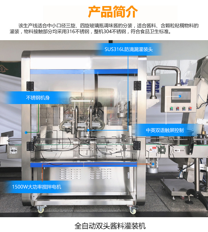 該生產(chǎn)線(xiàn)適合中小口徑三旋、四旋玻璃瓶調(diào)味醬的分裝,適合醬料、含顆粒黏稠物料的灌裝,物料接觸部分均采用316不銹鋼