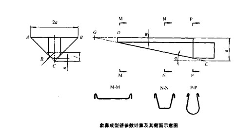 象鼻成型器的制造一般采用不銹鋼薄板,要求外表面光滑乎整。其三角部分和圓弧槽部分可用整塊板料卷曲而成,因?yàn)樗鼈兊恼归_(kāi)寬度是相等的。下圖所示是象鼻成型器結(jié)構(gòu)及展開(kāi)圖,沿虛線卷折即可制得成型器,圖中參數(shù)可通過(guò)計(jì)算加以選擇。