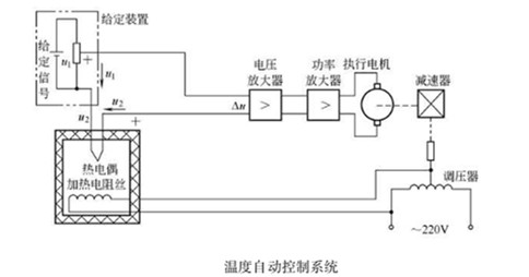 如果將控溫過程中的人工操作 (檢測和調(diào)節(jié)) 換由自動控制裝置完成,則成為包裝機(jī)自動控溫系統(tǒng)。如下圖所示,檢測元件熱電偶檢測恒溫箱內(nèi)的溫度,并將溫度轉(zhuǎn)換為對應(yīng)的電壓信號2 ,同時反饋給比較器。比較器比較表示給定溫度的給定電壓信號1與檢測電壓信號2的大小,得到溫差信號,其大小和正負(fù)代表溫差的大小和方向。溫差信號△經(jīng)電壓放大和功率放大后,控制執(zhí)行電機(jī)的轉(zhuǎn)速和方向,執(zhí)行電機(jī)通過傳動裝置拖動調(diào)壓器觸頭調(diào)節(jié)供熱電壓。當(dāng)溫度偏高時,動觸頭向著減小電壓( 電流)方向轉(zhuǎn)動; 反之,當(dāng)溫度偏低時,動觸頭則向著增大電壓( 電流)方向運動,直至恒溫箱內(nèi)溫度達(dá)到給定溫度,溫差信號△=0 時觸頭停止運動。