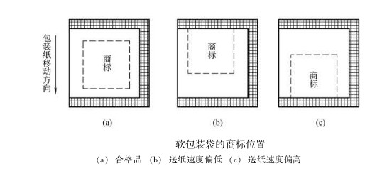 在包裝作業(yè)過程中,卷筒半徑逐漸減小,包裝紙所受張力發(fā)生變化,送紙輥與包裝紙之間的摩擦因數(shù)受環(huán)境溫濕度的影響而發(fā)生波動,加上商標印刷誤差,以及送紙、縱封、橫封、切斷各部分速度的差異等因素,使得刀輥的實際切線偏離規(guī)定部位。即使這種位置誤差很小,例如在某—包裝袋上只偏差0.1mm,但包裝機速度很快,有的高達200包/min, 如不加以控制調節(jié),機器運行1垃i六 后,誤差積累可達20mm,切線嚴重偏離規(guī)定部位,降低了包裝質量,甚至造成廢品。如圖所示,圖(a)為合格品; 圖 (b) 為送紙速度偏低,商標后移; 圖 (c) 為送紙速度偏高, 商標前移。 為了保證包裝袋的正確封切, 必須在卷筒紙供送系統(tǒng)中, 引人商標圖案自動位置檢測與控制系統(tǒng)。目前應用廣泛的是光電自動定位系統(tǒng)。